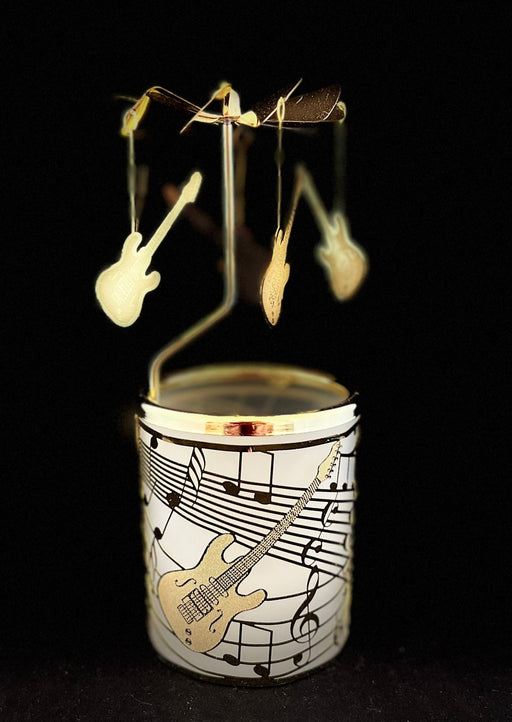 New candle carousel with wrap-around design. The votive glass base shows a solo silver guitar radiating notes on a music sheet as five guitars hang...