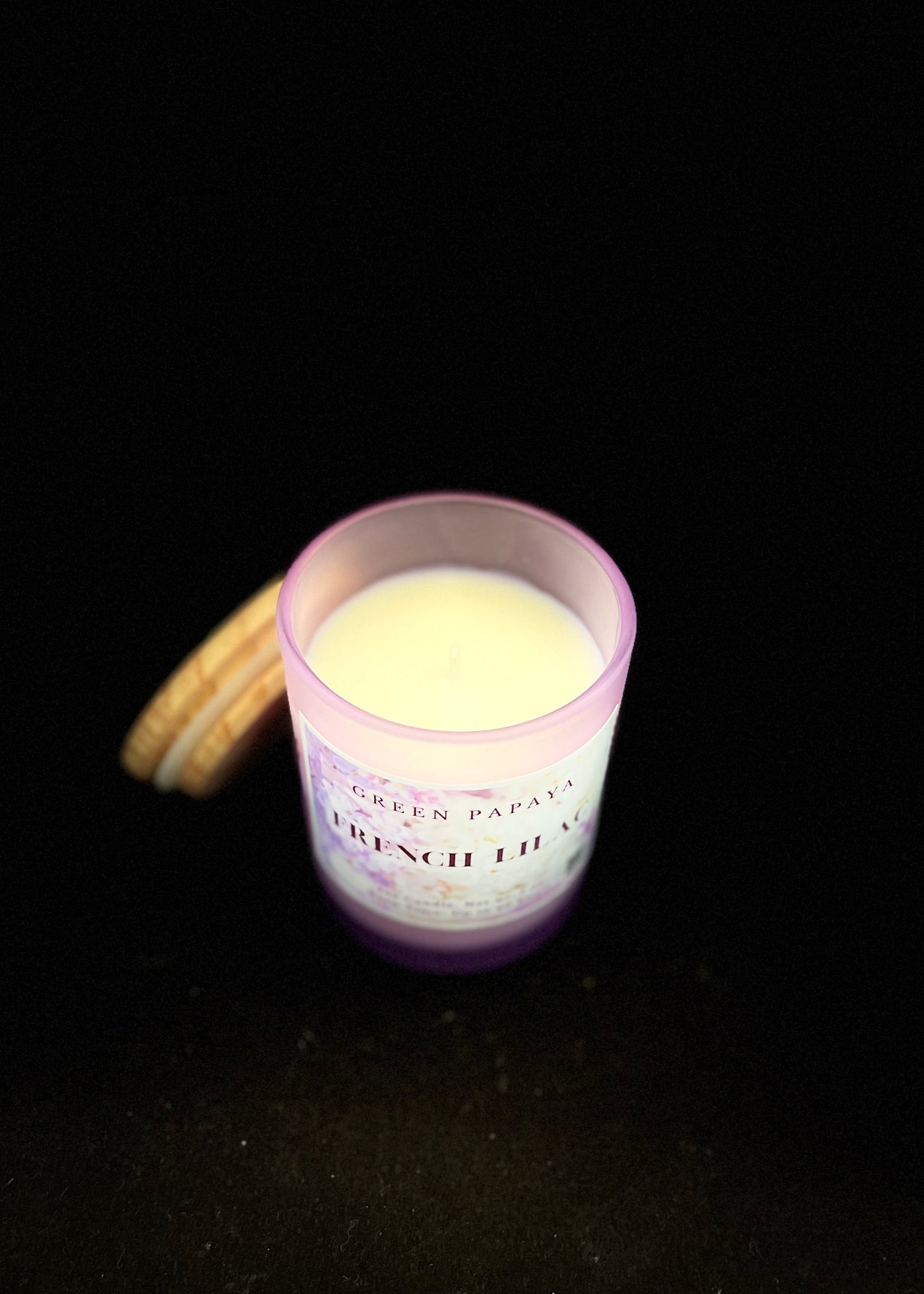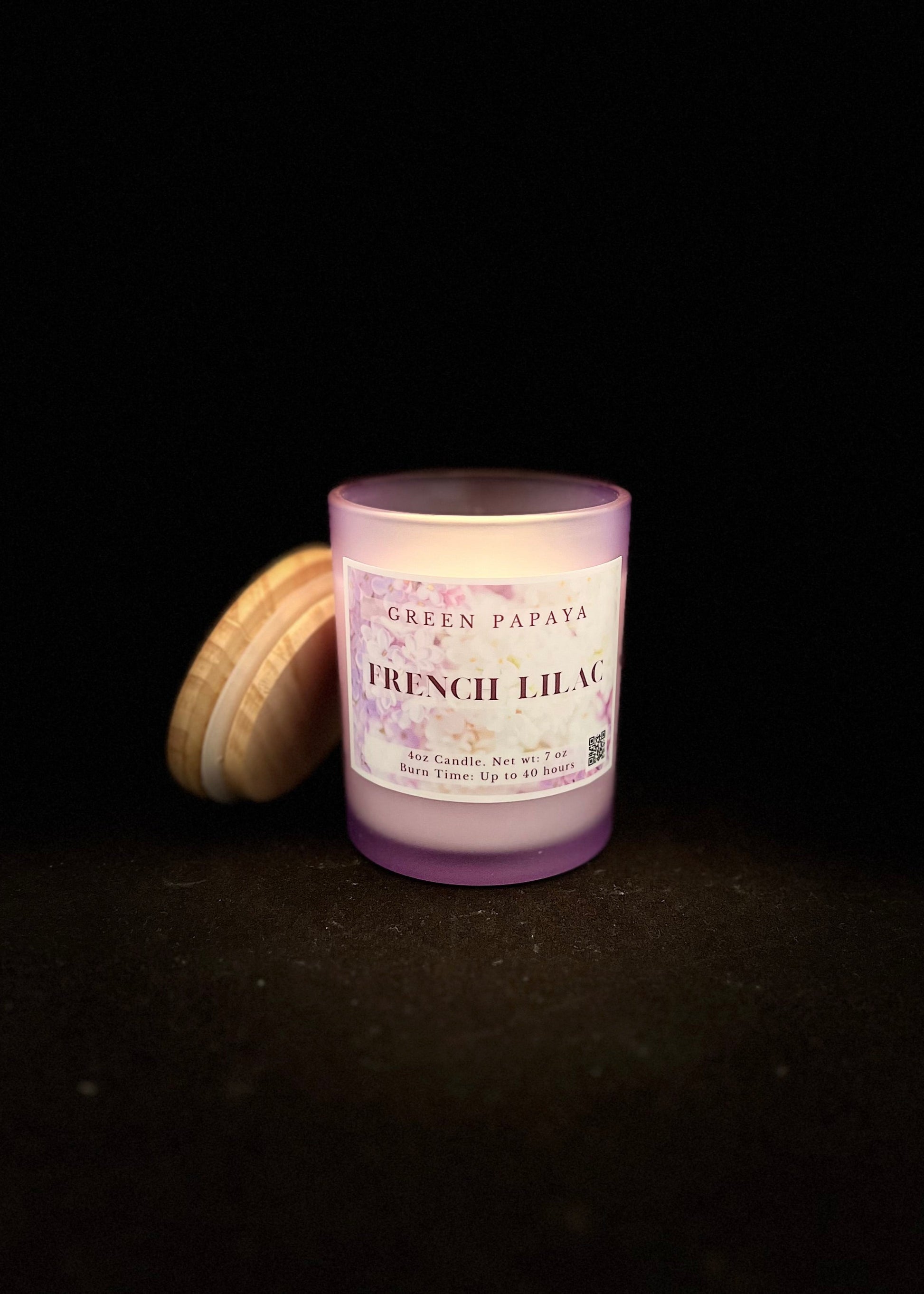 This is a 4oz candle in a 7oz frosted pastel purple vessel with bamboo lid.