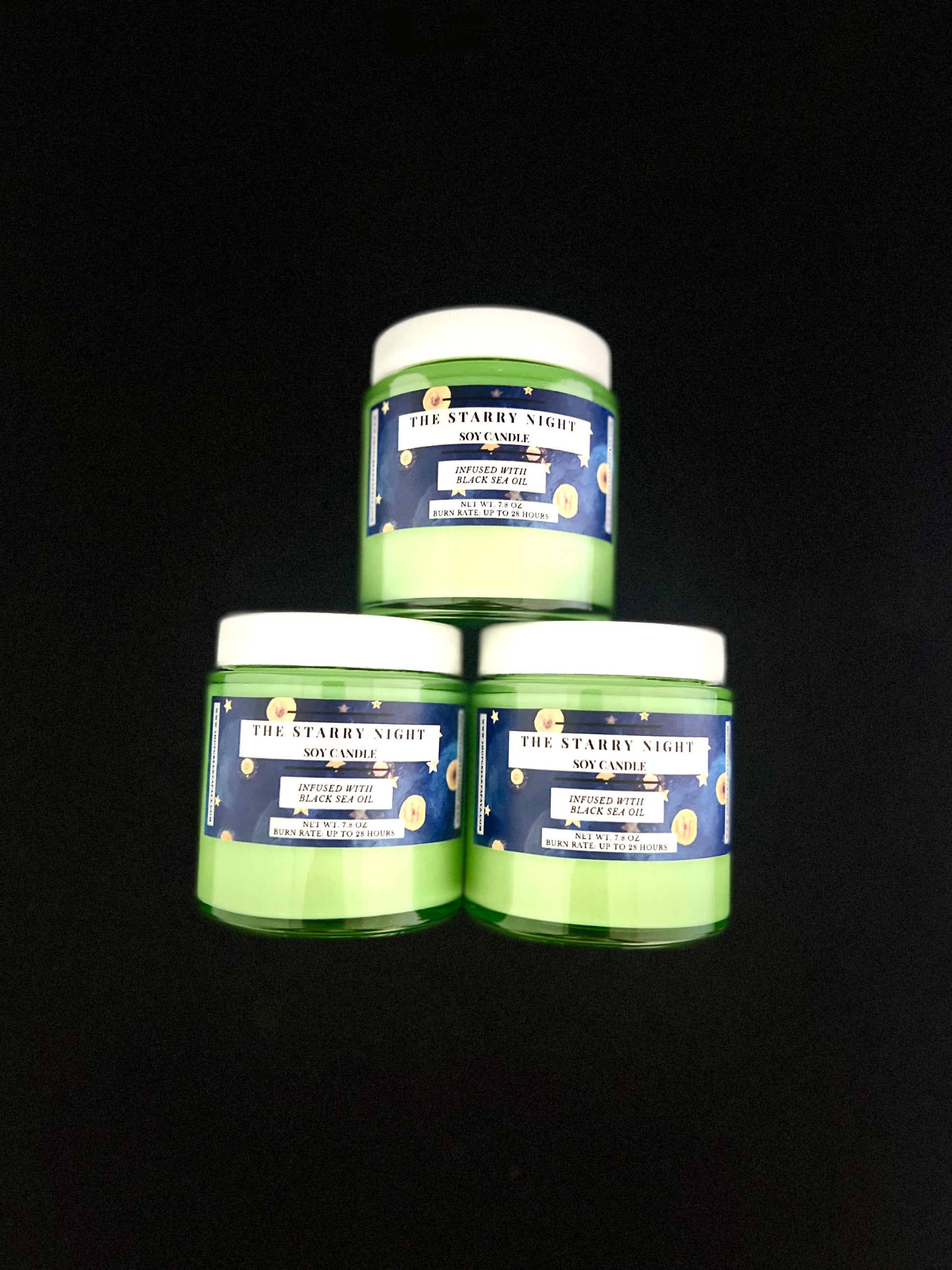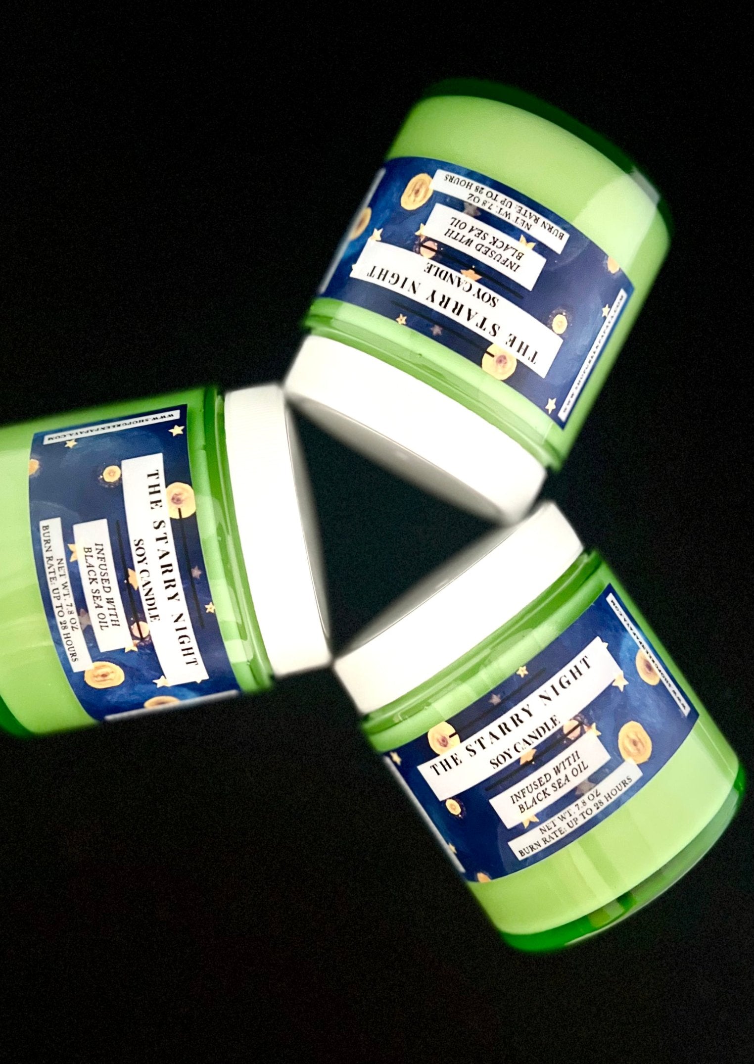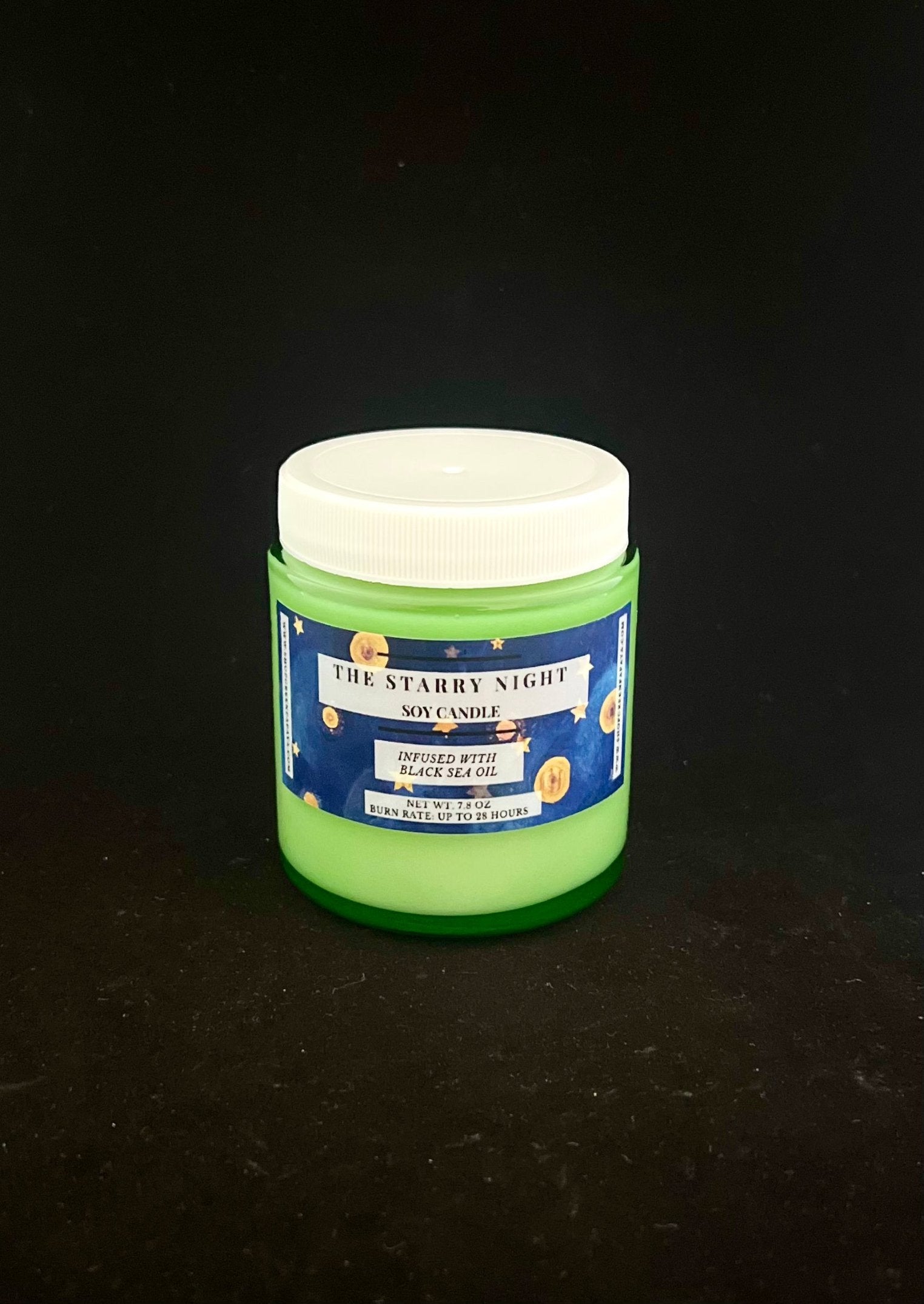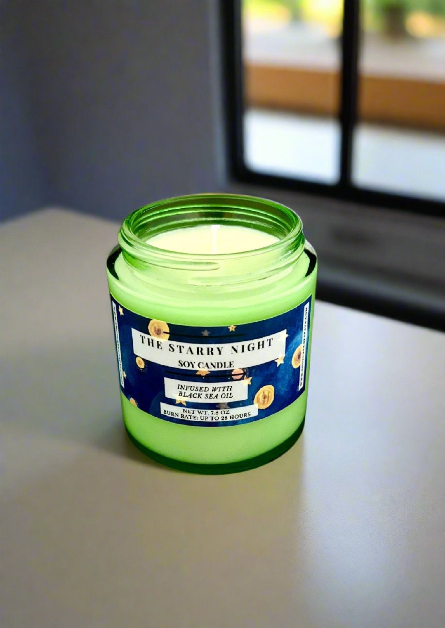 Inspired by Van Gogh's masterpiece, we created a natural candle infused with oils that take you to a calm and starry night. This natural candle in a green jar is infused with fragrance oils that contain a musky, marine, and earthy scent. It is rich and complex and, yet, pleasing to the nose. Just like Van Gogh's masterpiece is so pleasing and appealing to the eyes.