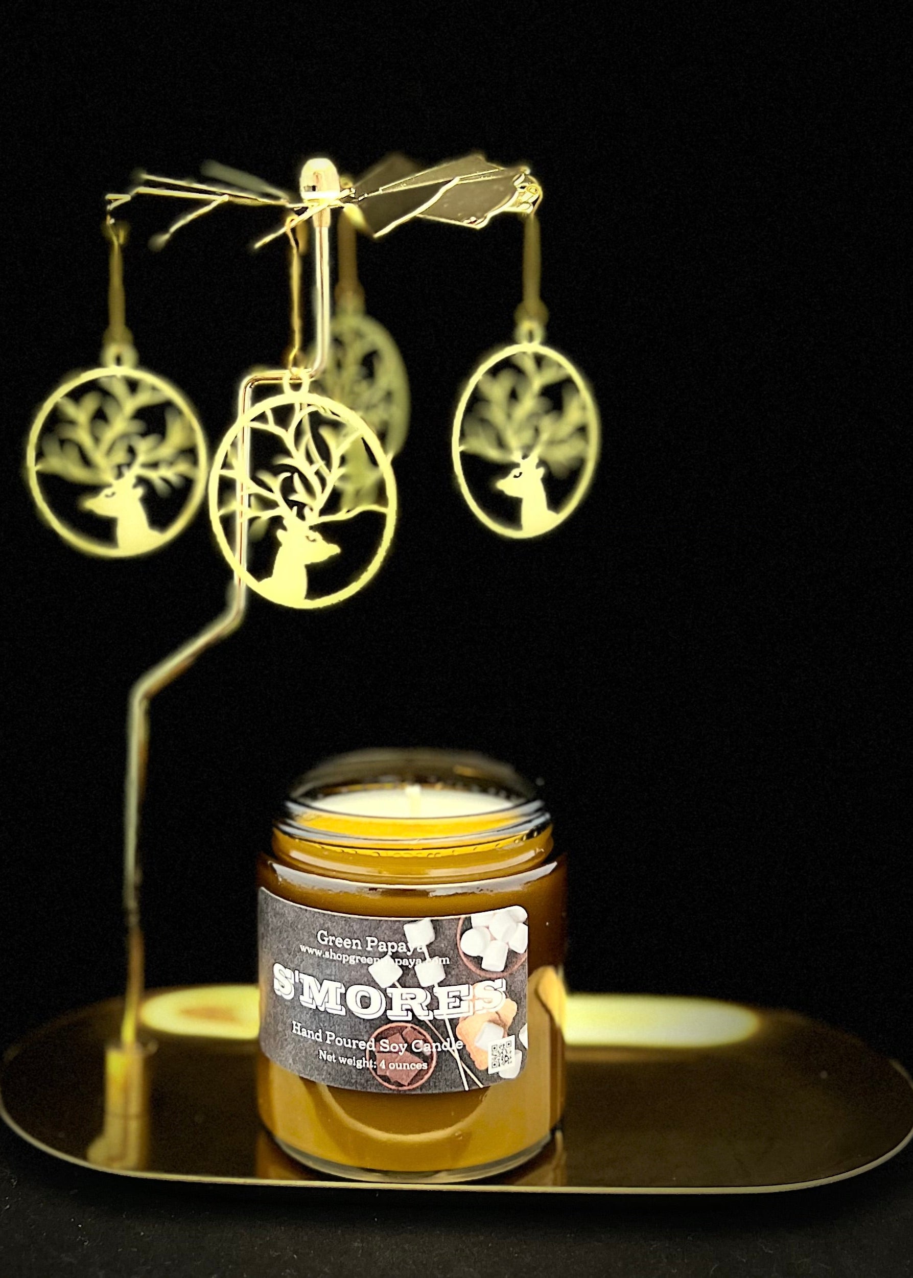 The metal plate comes with a magnetic bar to hold the rotary blades from which the four ornaments hang. Plate can hold up to 16oz jar candles. The candle carousel comes with its own box, perfect for the gift-giving season.