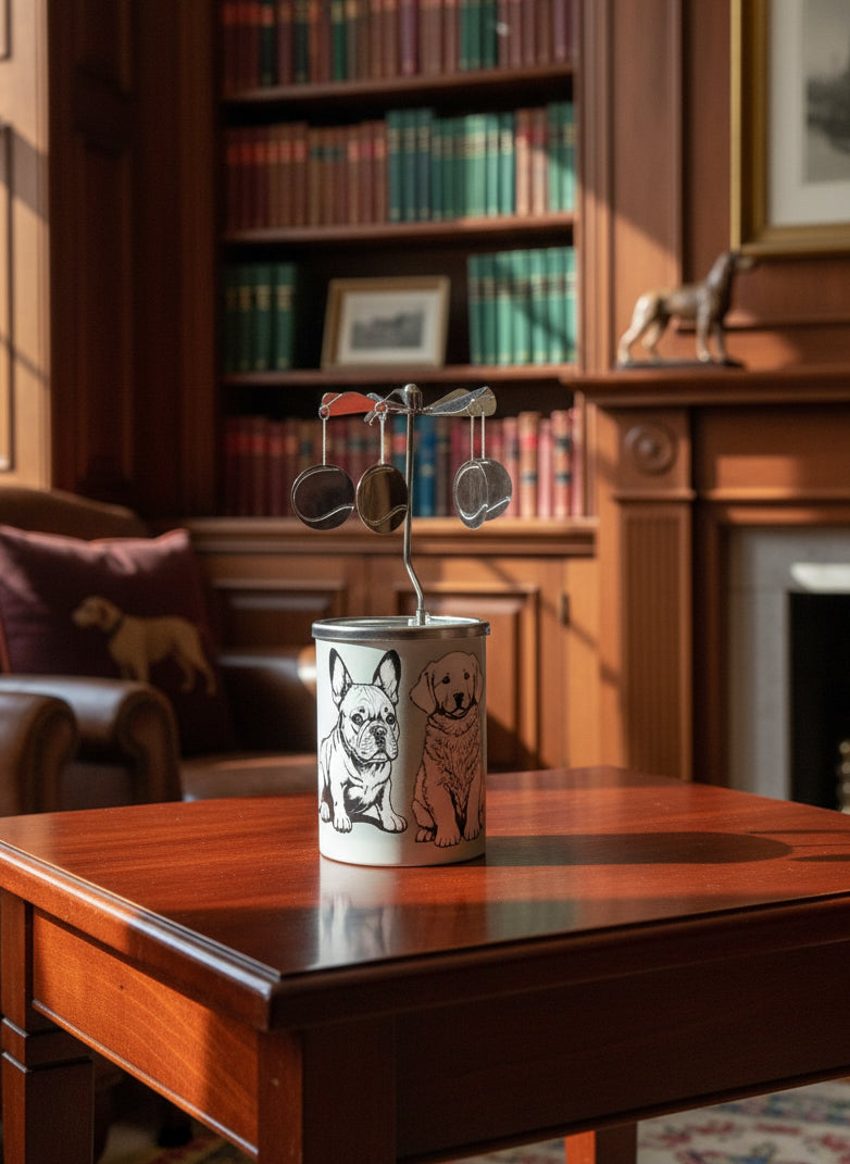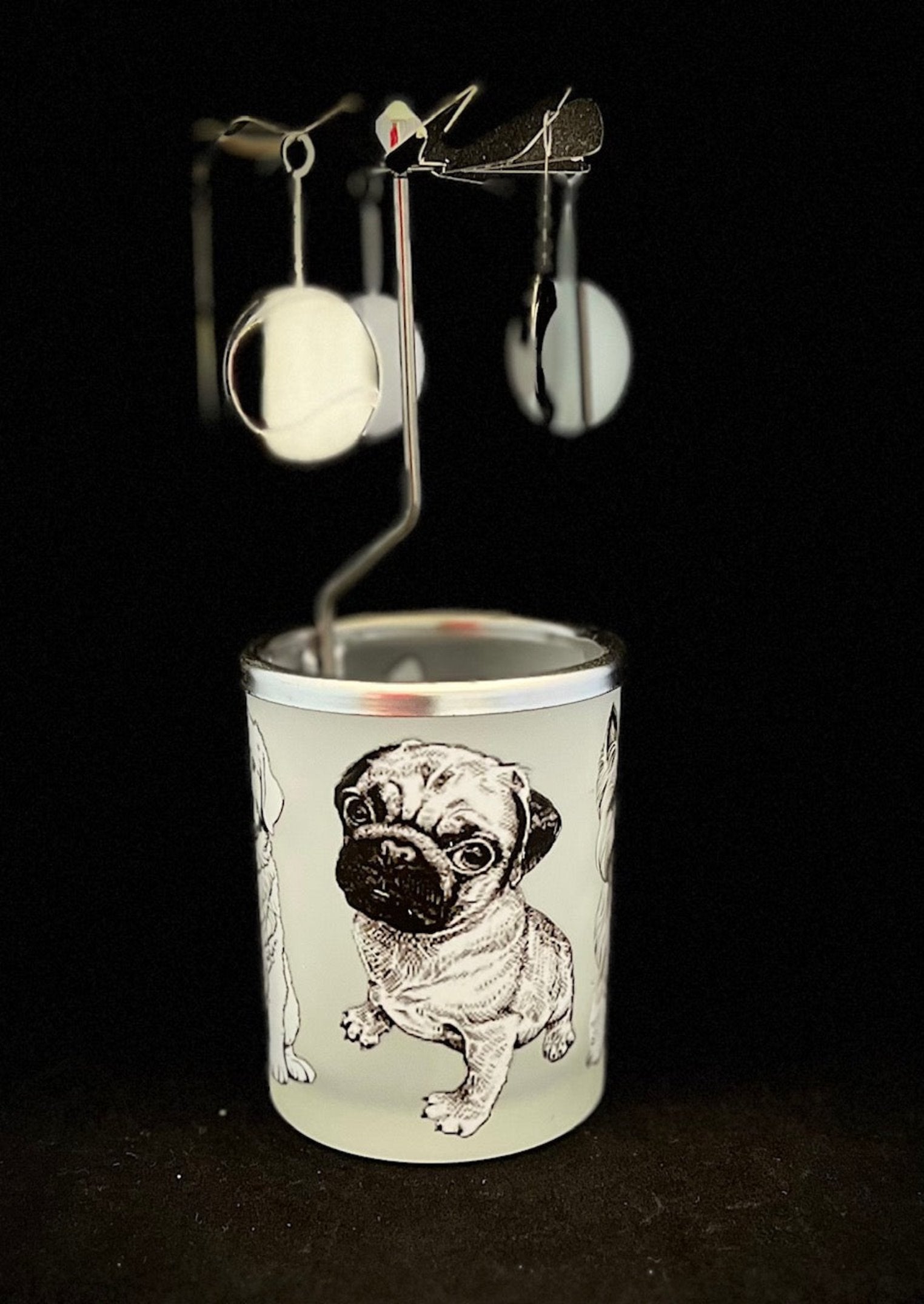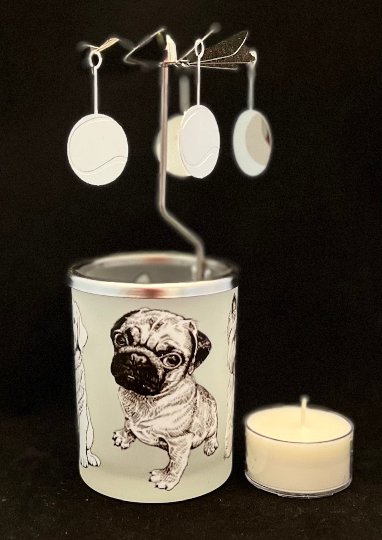 This candle carousel has four different breeds of dogs, French Bulldog, Yorkshire Terrier, Golden Retriever, and Pug. The ornament is a tennis ball in silver, one of their fave toys.